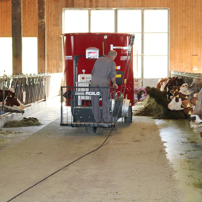 Nicht nur bei der reinen Fütterungstechnik, sondern auch bei der Entnahmetechnik und dem Beladen des Futters mithilfe des Mischwagens kann der Landwirt unsere unterschiedlichen Varianten ansehen und vergleichen: Die Fremdbefüller sind an einem Schlepper angehängt und lassen sich dann mit einem separatem Ladefahrzeug, beispielsweise einem Teleskoplader, befüllen.