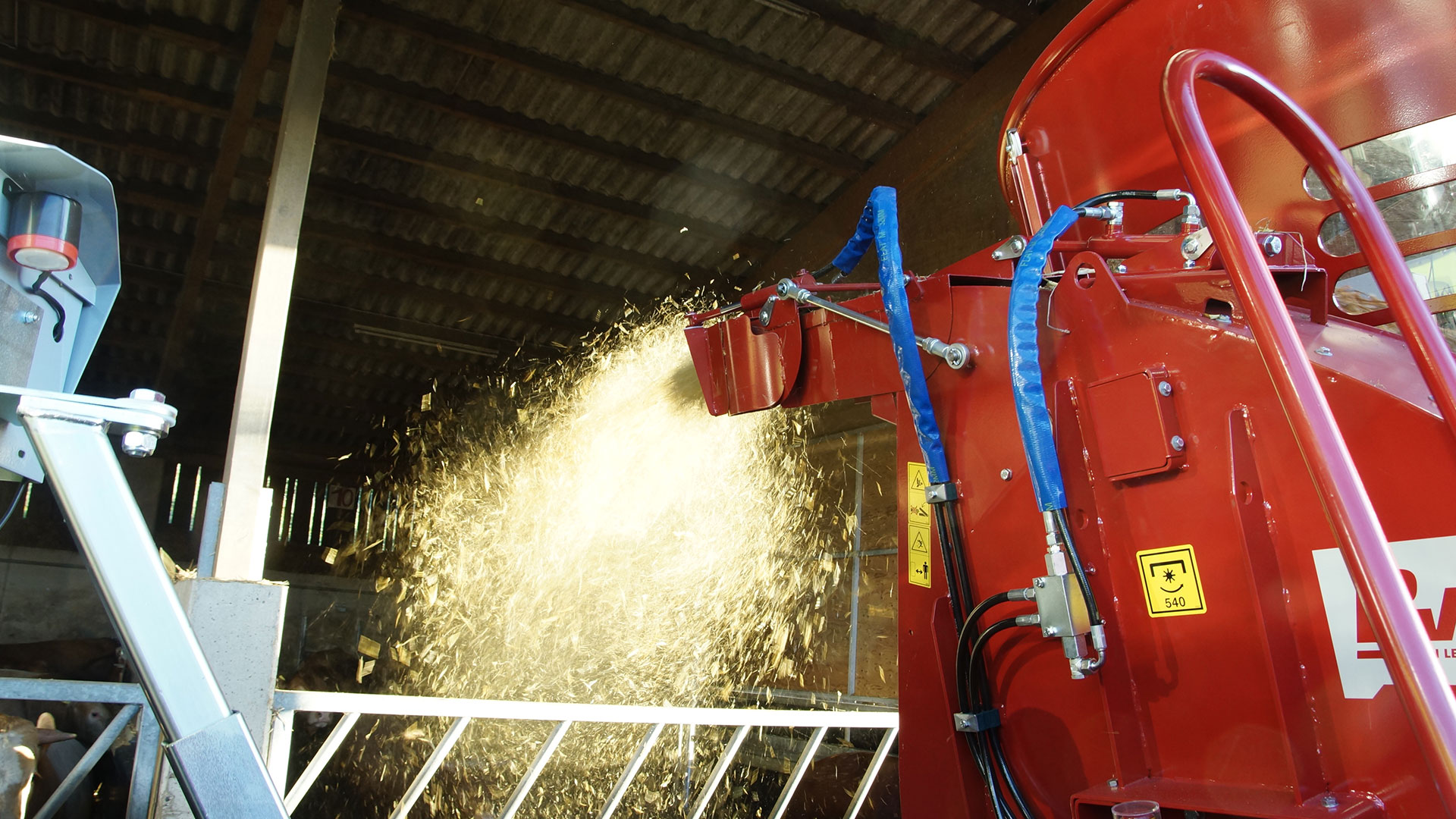 Fast alle unsere Futtermischwagen können mit unserem mechanisch angetriebenen Strohgebläse ausgestattet werden. Die patentierte, direkte Anbringung des Strohgebläses an die Mischwanne gewährleistet einen kontinuierlichen Materialfluss. Mit einer Wurfweite bis zu 30 m, seiner Leistung von 320 kg/min und der integrierten Steinfangmulde ist unser Strohgebläse ein echter Kraftprotz, der auf Sicherheit setzt.